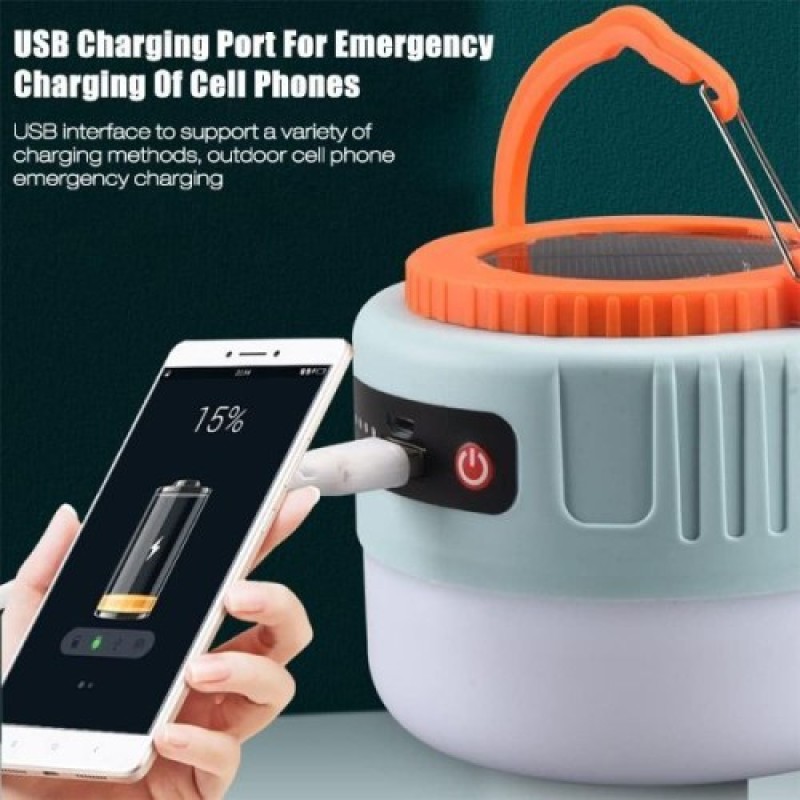 Solar LED kamp lambası, entegre 1200 mAh lityum iyon pil ile güneş enerjisi veya USB bağlantısı üzerinden şarj edilebilir. Aynı zamanda taşınabilir şarj cihazı olarak kullanılabilir ve telefon veya diğer cihazlarınızı USB bağlantısı üzerinden şarj edebilir. Kamp lambası, iki farklı ampul (projektör ve doğrudan ışık) ve üç ışık modu (yüksek ışık, orta ışık, flaş) sunar. 10 farklı parlaklık kademesi ile ayarlanan moda göre 5 ila 8 saat arasında yanar. IP45 koruma sınıfı sayesinde hafif yağmur ve karlı hava koşullarına dayanıklıdır. Hafif ve taşınabilir yapısıyla, kamp, seyahat, açık hava etkinlikleri gibi durumlar için ideal olup, ABS plastik ve alüminyum alaşımdan üretilmiştir.
